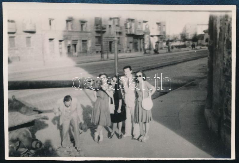 Leírás: 1956 Emberek pózolnak egy kilőtt szovjet tank ágyúcsövénél, fotó, 5,5×8,5 cm