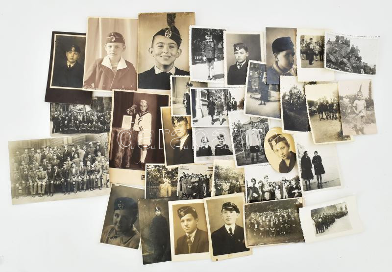 cca 1925-1946 Iskolai egyenruhát ill. sapkát viselő gyerekek (köztük darutollas sapkát viselőkkel), össz. 32 db fotó, részben feliratozva, változó méretben és állapotban