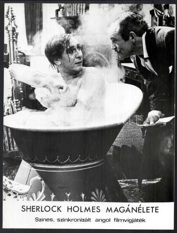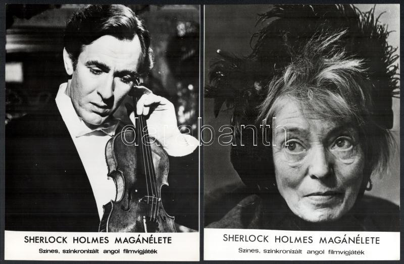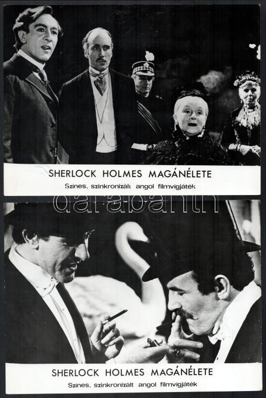 cca 1970 ,,Scherlock Holmes magánélete" című angol filmvígjáték jelenetei és szereplői, 9 db vintage produkciós filmfotó (vitrinfotó, lobbyfotó) ezüst zselatinos fotópapíron, a használatból eredő (esetleges) kisebb hibákkal, 18x24 cm