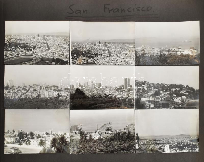 cca 1970 Vas Zoltán (1903-1983) író, kommunista politikus külföldi (amerikai) utazásának fotóalbuma: USA (New York, Washington, Las Vegas, San Francisco, stb.), Kanada, Párizs, London; az album végén hazai (Balaton, stb.) képekkel. Összesen több, mint 200 db fotóval. Nagyméretű, zsinórfűzéses albumban, 51x36 cm.