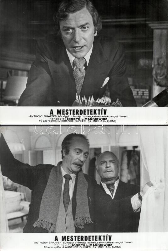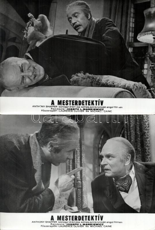 cca 1972 ,,A mesterdetektív" című angol film jelenetei és szereplői (Laurence Oliver és Michael Caine főszereplésével), 11 db vintage produkciós filmfotó ezüst zselatinos fotópapíron, a használatból eredő (esetleges) kisebb hibákkal, 18x24 cm