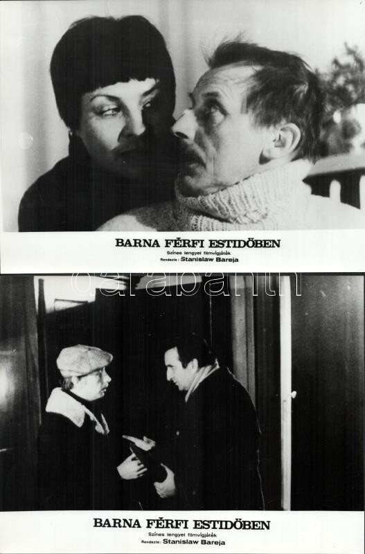 cca 1976 ,,Barna férfi esőidőben" című lengyel film jelenetei és szereplői, 13 db vintage produkciós filmfotó (vitrinfotó, lobbyfotó) ezüst zselatinos fotópapíron, a használatból eredő (esetleges) kisebb hibákkal, 18x24 cm