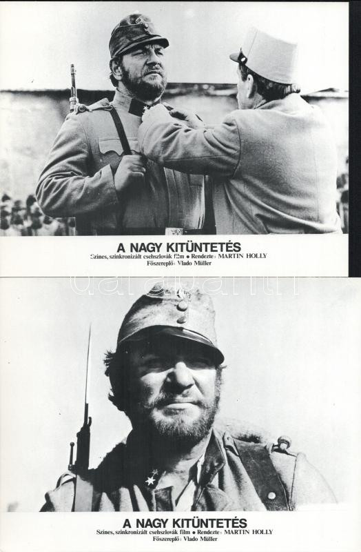 cca 1980 ,,A nagy kitüntetés" című csehszlovák film jelenetei és szereplői, 6 db produkciós filmfotó (vitrinfotó, lobbyfotó) nyomdatechnikával sokszorosítva kartonpapírra, egyoldalas nyomással, a használatból eredő (esetleges) kisebb hibákkal, 18x24 cm