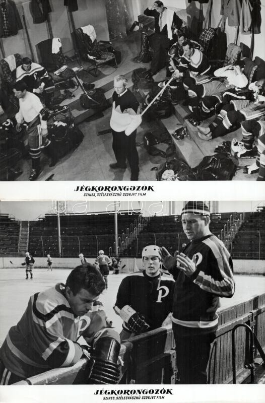 cca 1989 előtti ,,Jégkorongozók" című szovjet film jelenetei és szereplői, 13 db vintage produkciós filmfotó (vitrinfotó, lobbyfotó) ezüst zselatinos fotópapíron, a használatból eredő (esetleges) kisebb hibákkal, 18x24 cm