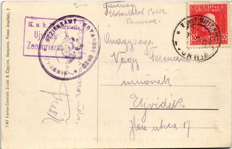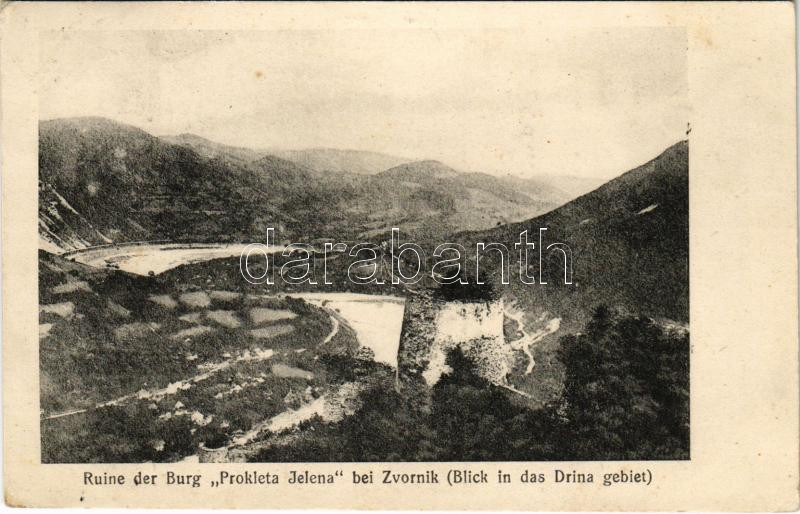 Zvornik, Ruine der Burg Prokleta Jelena bei Zvornik (Blick in das Drina gebiet) / castle ruins + "K.U.K. MILIT. POST ZVORNIK" "K.u.K. Zensurstelle Ujvidék Zensuriert 3" (EK)