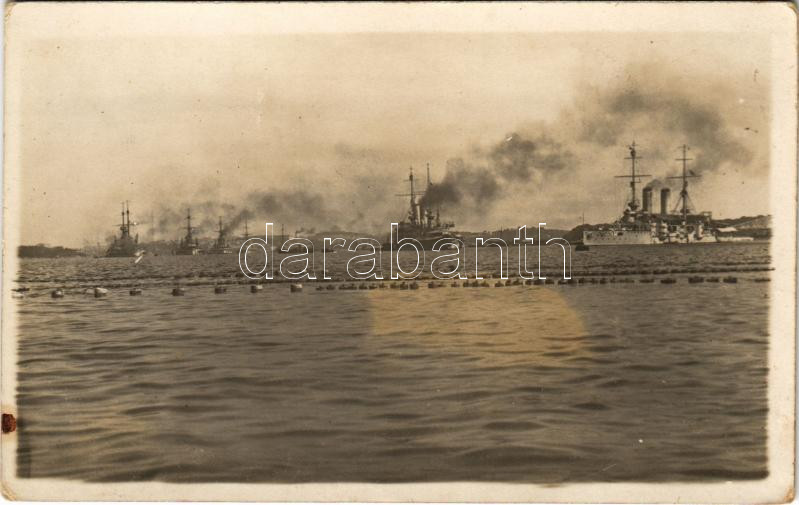 Osztrák-magyar haditengerészeti hármas védelmi hálók a tengeralattjáró támadások ellen / K.u.k. Kriegsmarine / Austro-Hungarian Navy triple nets protecting the battleship anchorage in Pola against submarine attacks. photo (fl)