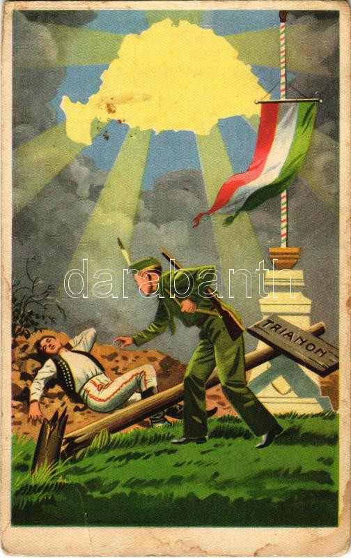 Leírás: 1939 Ébreszt a magyar jövő. Kiadja az Ereklyés Országzászló Nagybizottsága / Hungarian irredenta propaganda art postcard, Treaty of Trianon (EB)