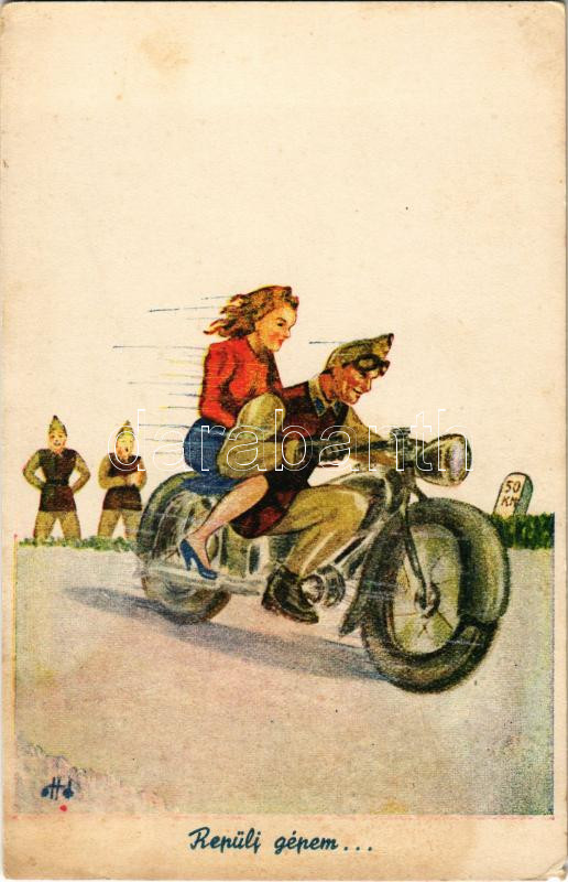 Repülj gépem... / WWII Hungarian military art postcard, soldier on mot... https://www.darabanth.com/hu/461-Gyorsarveres/461.0/Kepeslapok/Katonai~1000077/Repulj-gepem-WWII-Hungarian-military-art-postcard-soldier-on-motorbicycle-with-woman-s-Otto~II3094522
