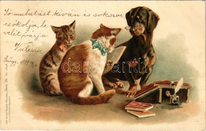 1899 (Vorläufer) Kutya tanár úr és a cica diákok / Dog teacher and cat... https://www.darabanth.com/hu/461-Gyorsarveres/461.0/Kepeslapok/Muveszlapok~1000084/1899-Vorlaufer-Kutya-tanar-ur-es-a-cica-diakok-Dog-teacher-and-cat-students-Lith-Artist~II3096297