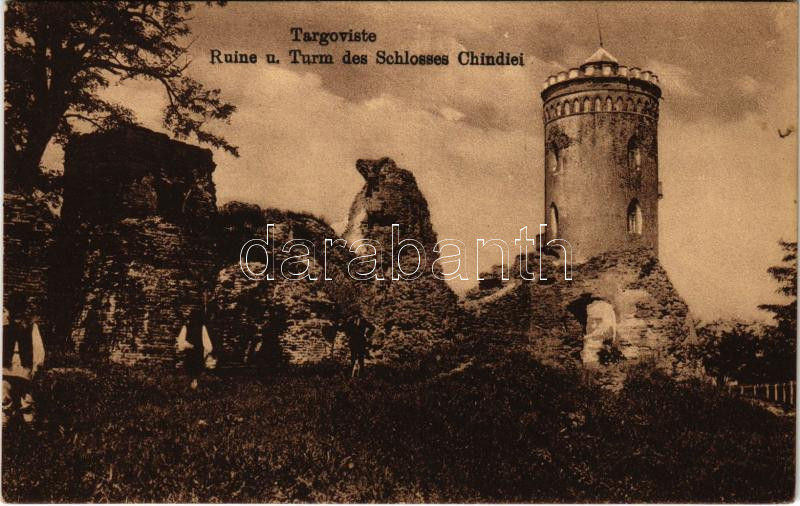 Leírás: Targoviste, Tergovistye, Tirgovics; Ruine u. Turm des Schlosses Chindiei / castle ruins and tower