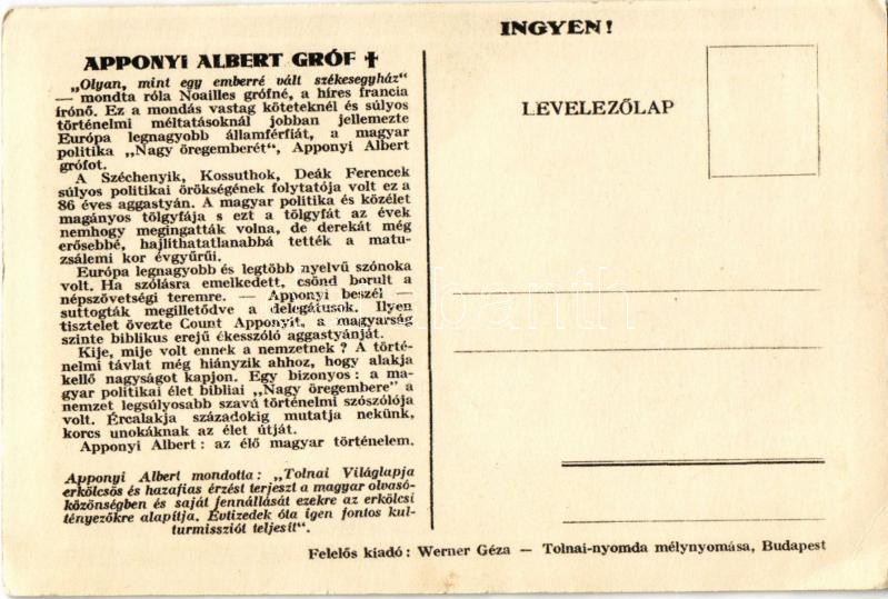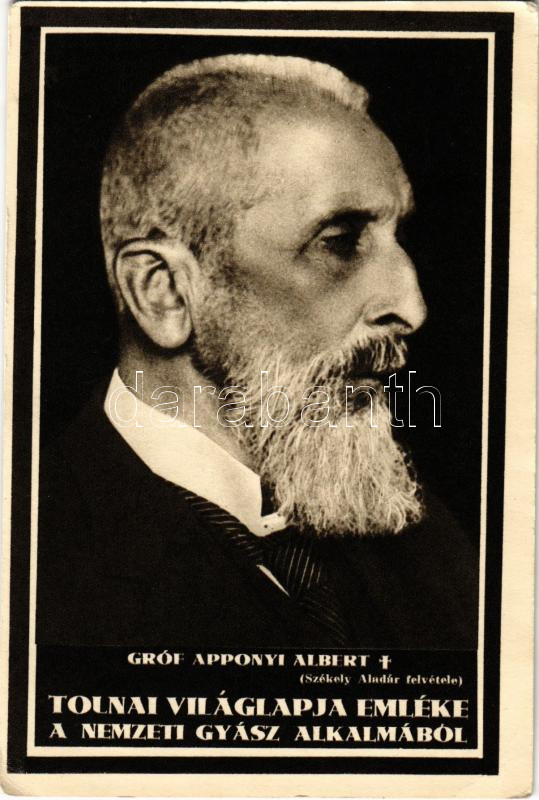 Gróf Apponyi Albert gyászlapja. Tolnai Világlapja emléke a nemzeti gyá... https://www.darabanth.com/hu/461-Gyorsarveres/461.0/Kepeslapok/Uralkodo-Politikus~1000097/Grof-Apponyi-Albert-gyaszlapja-Tolnai-Vilaglapja-emleke-a-nemzeti-gyasz-alkalmabol-Szekely~II3098356