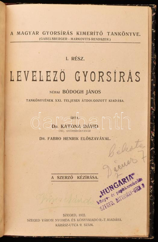 Dr. Katona Dávid: A levelező gyorsírás. A magyar gyorsírás kimerítő tankönyve (Gabelsberger-Markovits-rendszer). I rész. Szeged, 1922, Szeged Városi Nyomda és Könyvkiadó Rt., 2 sztl. lev.+ 60 p. Átkötött félvászon-kötésben, körbevágott lapokkal, tulajdonosi névbejegyzéssel. + Általános szabályok. (Szépírás). H.n., é.n., ny.n., 28 p. Félvászon-kötésben, helyenként kissé sérült, foltos lapokkal.