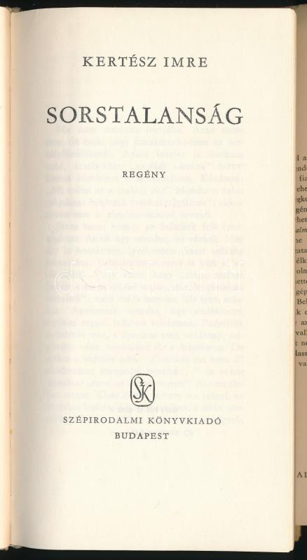 Kertész Imre: Sorstalanság. Regény. Bp.,, 1975, Szépirodalmi Könyvkiadó,(Nyomdaipari Szakmunkásképző Intézet-ny.), 291 p. + [1] p. Első kiadás. A borító- és kötésterv Engel Tevan István munkája. Kiadói kartonált papírkötés, kiadói kissé szakadt papír védőborítóban.
