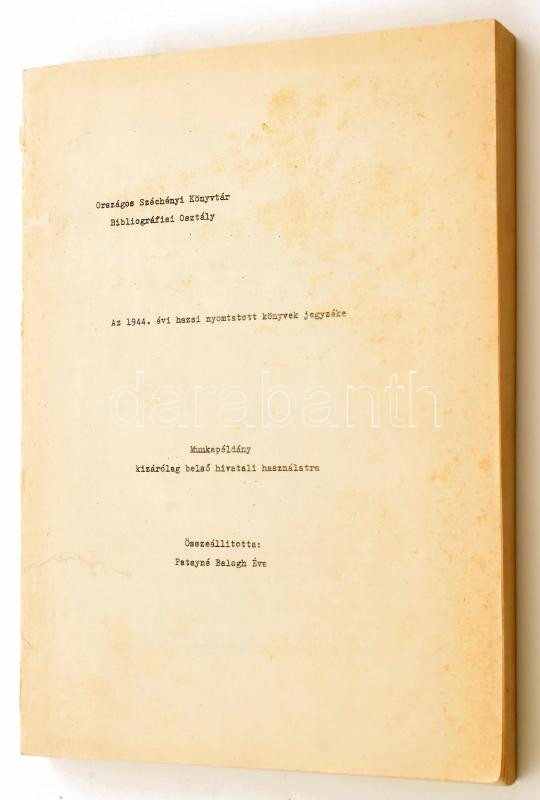 Patayné Balogh Éva (szerk.): Az 1944. évi hazai nyomtatott könyvek jegyzéke. Munkapéldány, kizárólag belső hivatali használatra. Bp., 1972, OSZK. Papírkötés, gerinc és borító kissé foltos.