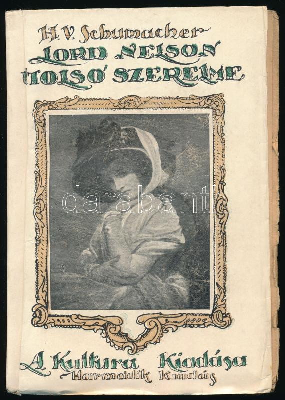 Schumacher, [Heinrich Vollrat]: Lord Nelson utolsó szerelme. Ford.: Somlyó Zoltán. A Kultura Regénytára XVIII. köt. Bp., 1920, Kultura Könyvkiadó és Nyomda Rt., 349+(3) p. Harmadik kiadás. Kiadói papírkötés, helyenként kissé sérült lapszélekkel.