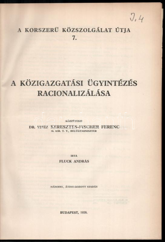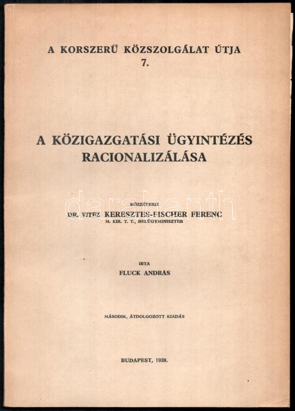 Fluck András: A közigazgatási ügyintézés racionalizálása. Írta: - - . Közzéteszi: Dr. vitéz Keresztes-Fischer Ferenc. A korszerű szolgálat útja 7. Bp., 1938, (M. Kir. Állami-ny.), 146+(2) p. Második, átdolgozott kiadás. Kiadói papírkötés, jó állapotban.