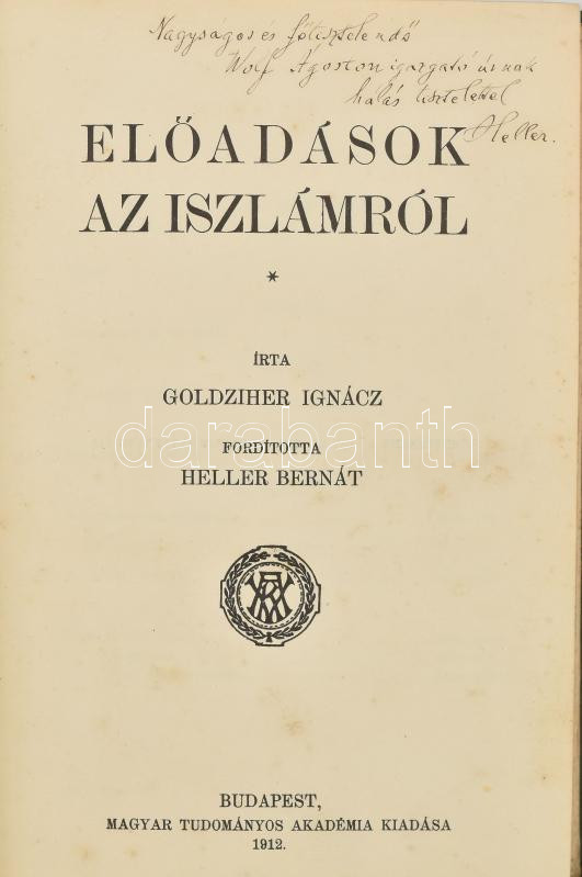 Goldziher Ignác: Előadások az iszlámról. Ford.: Heller Bernát. (A fordító által DEDIKÁLT). Bp., 1912, MTA, VIII+413 p. Kiadói aranyozott gerincű egészvászon-kötés, kissé foltos borítóval, néhány kissé foltos lappal, egyébként jó állapotban. A kötet fordítója, Heller Bernát (1871-1943) irodalomtörténész, orientalista, folklorista, az Országos Rabbiképző Intézet tanára által Wolf Ágoston igazgató részére DEDIKÁLT példány.
