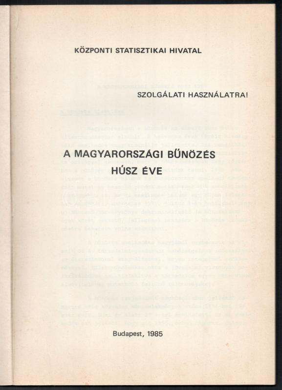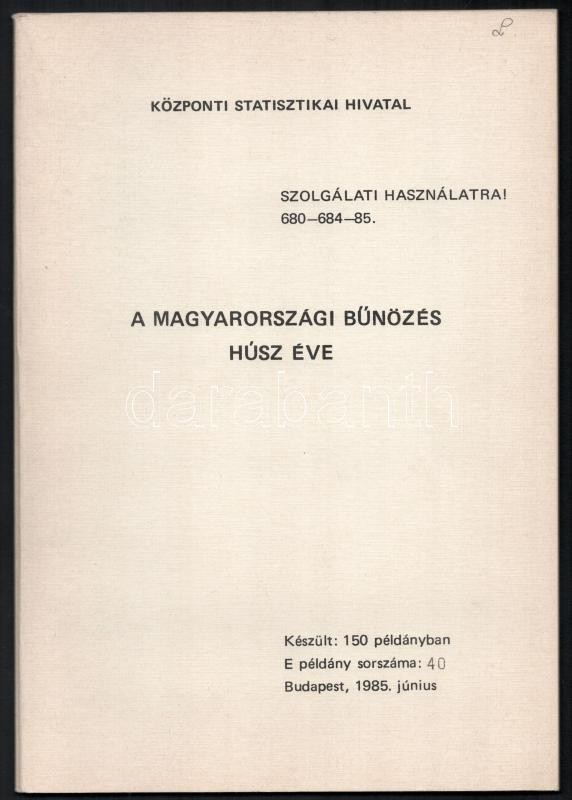 A magyarországi bűnözés húsz éve. Bp., 1985, Központi Statisztikai Hivatal. Készült 150 példányban. 40. számozott példány. Kiadói papírkötés, jó állapotban.