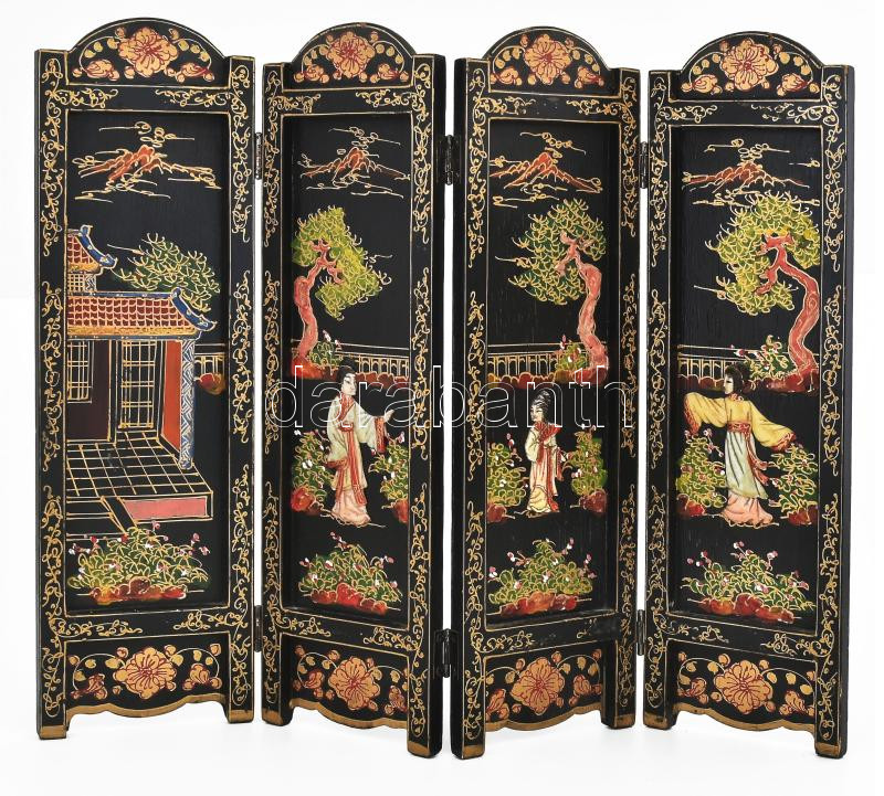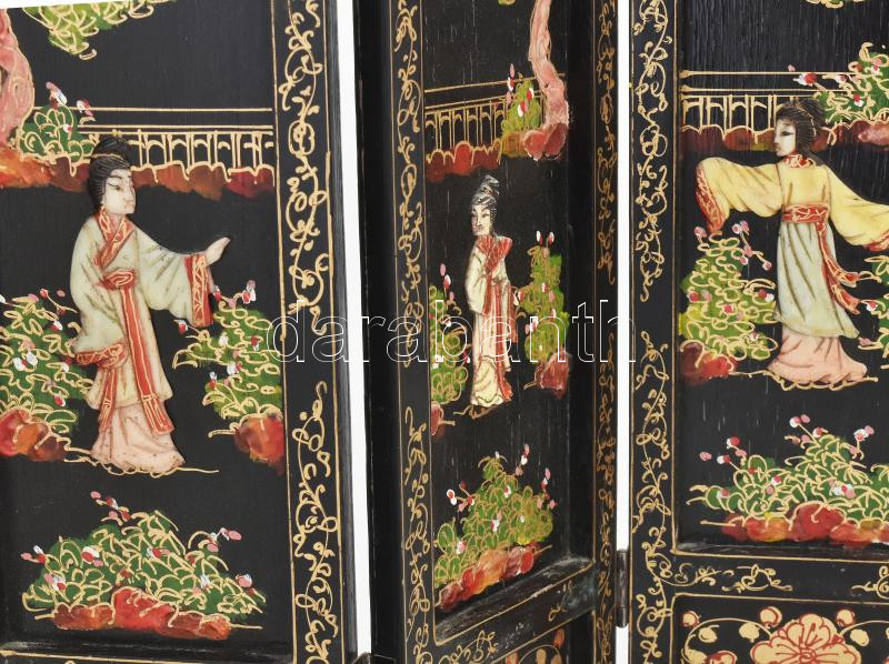 Távol-keleti paraván, 4 részes, festett fa, három plasztikus figurával (egy hiányzik), XX. sz. közepe körül, kisebb felületi hibákkal, kopásokkal, 48x39,5 cm