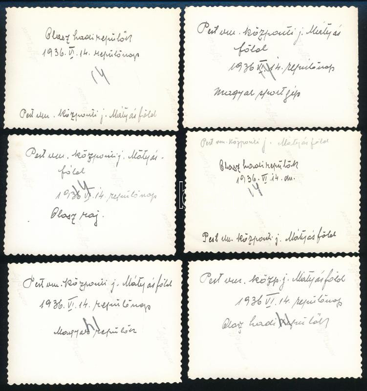 Leírás: 1936 Budapest, repülőnap Mátyásföldön, 6 db fotó hátoldalon feliratozva, 6×9 cm