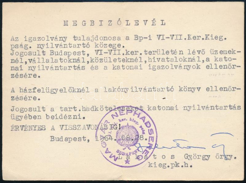 1964 Bp., Magyar Néphadsereg VI-VII. ker. kieg. parancsnokság megbízól... https://www.darabanth.com/hu/461-Gyorsarveres/461.0/Mutargy-papirregiseg-egyeb/Militaria~2000009/1964-Bp-Magyar-Nephadsereg-VI-VII-ker-kieg-parancsnoksag-megbizolevele-igazolvany-katonai~II3091802