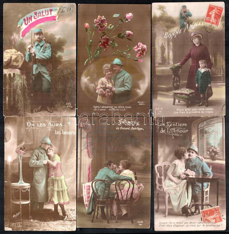 Leírás: cca 1916 10 db francia katonai propaganda képeslap, színezett fotólapok, hátoldalán egy francia katona levelezésével