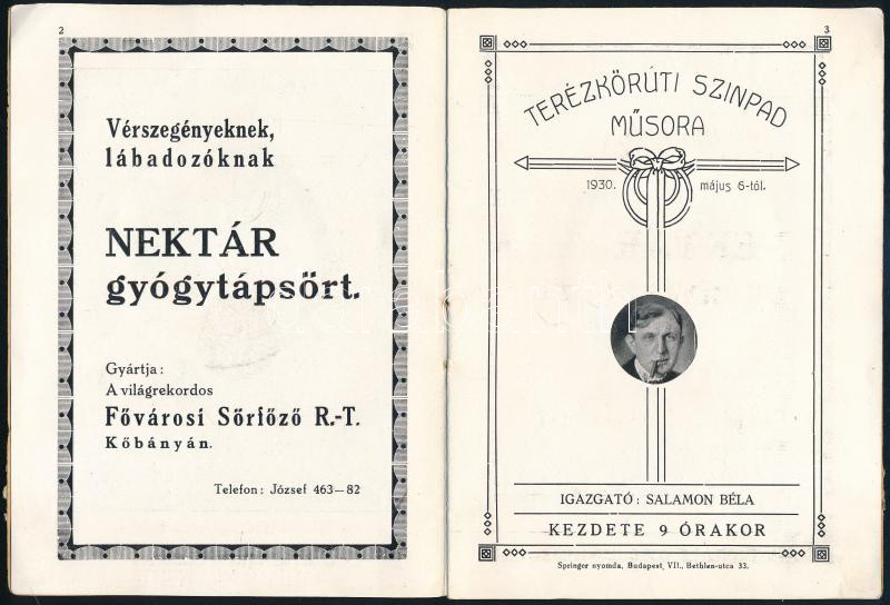 1930 A Terézkörúti Színpad műsora 1930. május 6-tól, műsorfüzet reklámokkal. Bp., Springer-ny., 16 p. Kiadói tűzött papírkötés, kissé foltos borítóval.