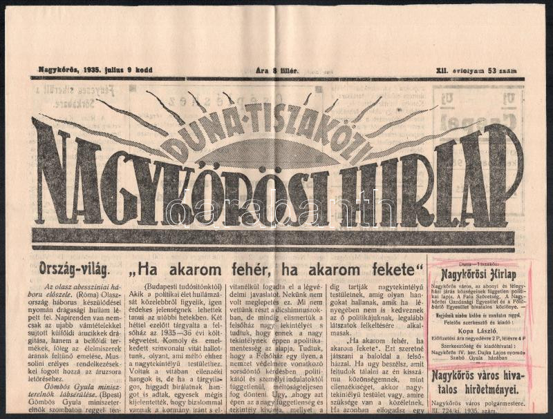 1935 Duna-Tiszaközi Nagykőrösi Hírlap XII. évf. 53. szám + Nagykőrösi ... https://www.darabanth.com/hu/461-Gyorsarveres/461.0/Mutargy-papirregiseg-egyeb/Nyomtatvanyok~2000015/1935-Duna-Tiszakozi-Nagykorosi-Hirlap-XII-evf-53-szam-plus-Nagykorosi-hirado-XIII-63-szam~II3096160