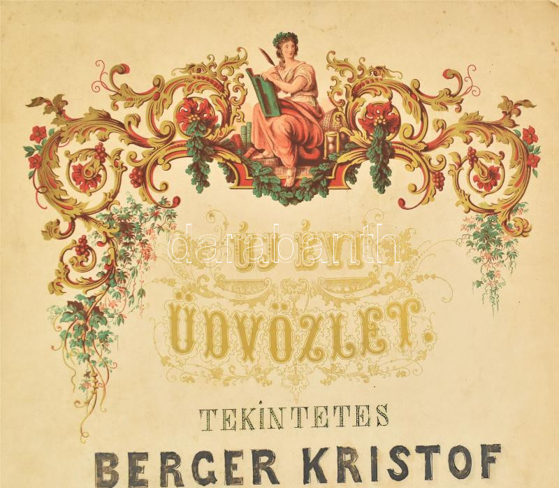 1870 "Új évi üdvözlet tekintetes Berger Kristof ellenőr urnak tisztelet jeléül A pesti kir. zálogházi személyzettől 1870", a címlap felső része díszesen litografált, az alsó része kézzel festett, papír, 2. lapon aláírásokkal, közte Kaunitz Tivadar zálogházi igazgató aláírásával is Berger Kristóf zálogházi ellenőr részére, lapszéli szakadásokkal, 2 sztl. lev., 46x30 cm