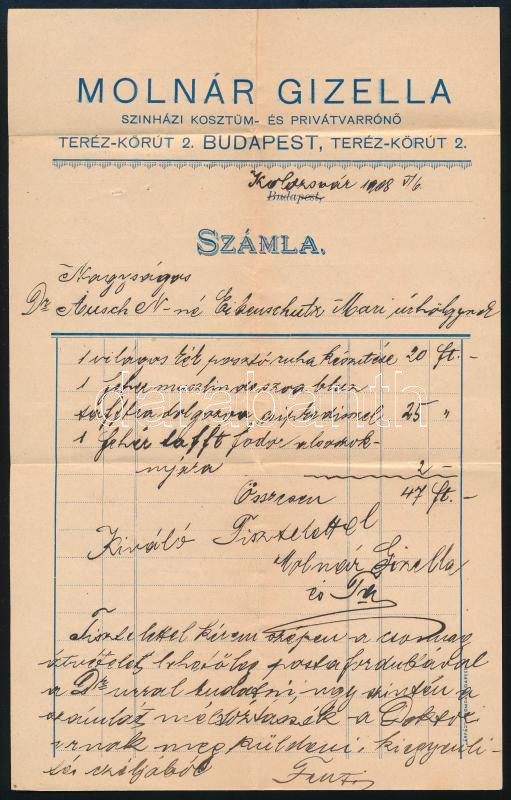 Leírás: 1908 Kolozsvár, Molnár Gizella színházi kosztüm- és privát varrónő fejléces számlája Eibenschütz Mari (1856-1938) színésznőnek