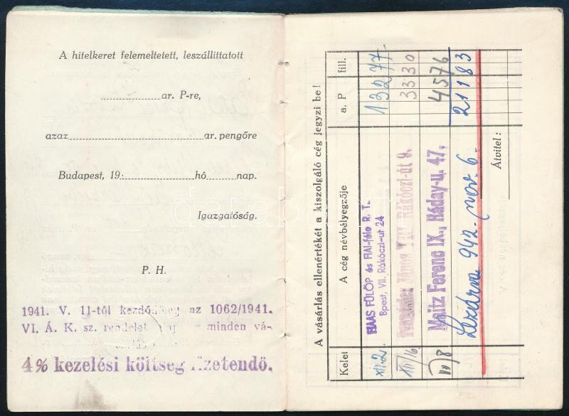 Leírás: 1941 Baross Szövetség Tagjaiból Alakult Áruhitel és Értékesítő Szövetkezet vásárlási igazolványa Patai József László részére, 50f okmánybélyeggel