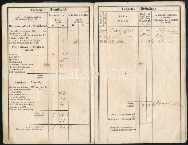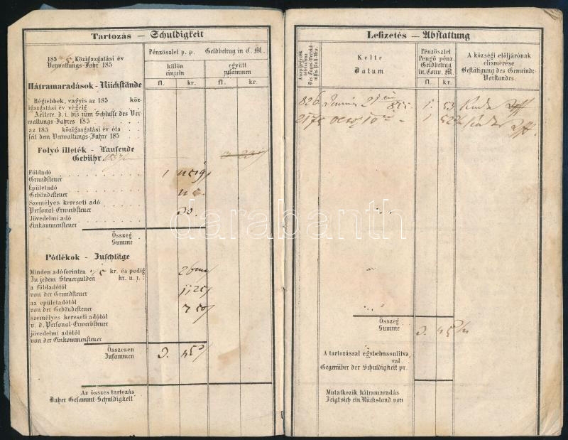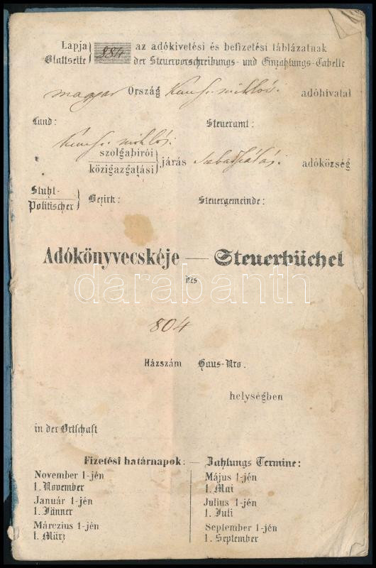 Leírás: cca 1840 Szabadszállási háztulajdonos adókönyvecskéje sok bejegyzéssel