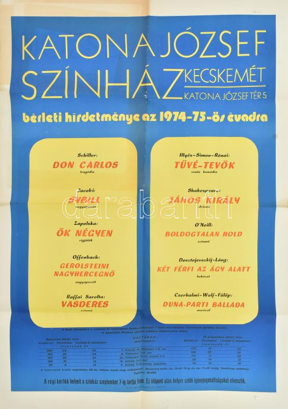 1974 A kecskeméti Katona József Színház plakátja, hajtott, szakadásokk... https://www.darabanth.com/hu/461-Gyorsarveres/461.0/Mutargy-papirregiseg-egyeb/Plakat~2000016/1974-A-kecskemeti-Katona-Jozsef-Szinhaz-plakatja-hajtott-szakadasokkal-100x68-cm~II3099675