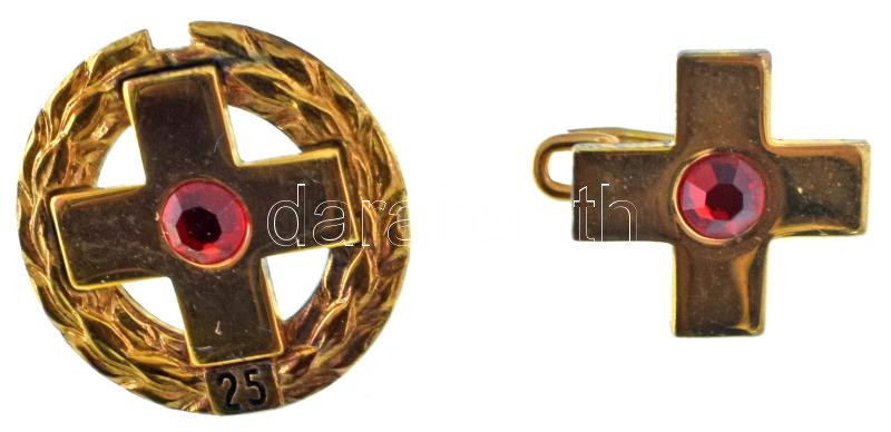 Leírás: DN "Vöröskereszt" aranyozott, jelzett Ag jelvény sérült dísztokban (0.935/1,06g) + DN "Vöröskereszt 25" aranyozott, jelzett Ag jelvény aranyozott díszítménnyel, dísztokban (0.925/br.2,26g) T:UNC,AU