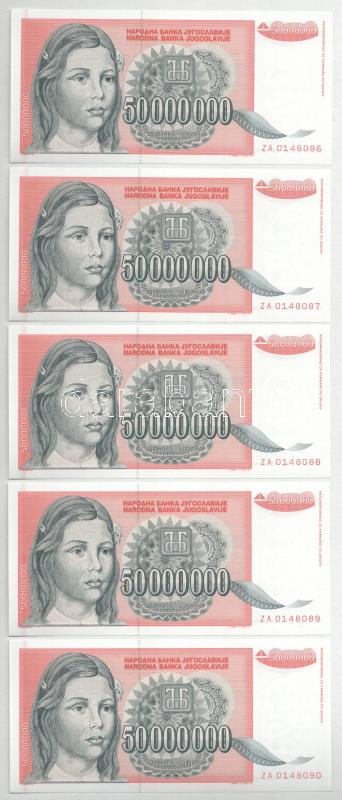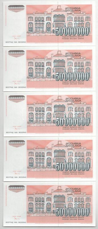 Yugoslavia 1993. 50.000.000 Dinara (5x) replacement issues, consecutive serials "ZA 0148086 - ZA 0148090" T:UNC