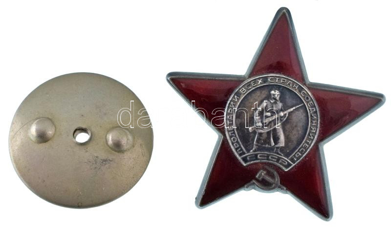 Szovjetunió 1930. "Vörös Csillag Érdemrend" zománcozott, jelzetlen Ag kitüntetés csavaros hátlappal, "3398746" sorszám és "Monetnij Dvor" gyártói jelzés a hátoldalán T:XF patina Soviet Union 1930. "Order of the Red Star" enamelled Ag decoration without hallmark, with screw back, with "3398746" serial number and "Monetniy Dvor" maker's mark on the back C:XF patina