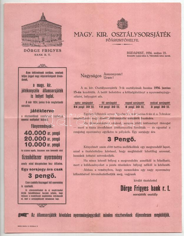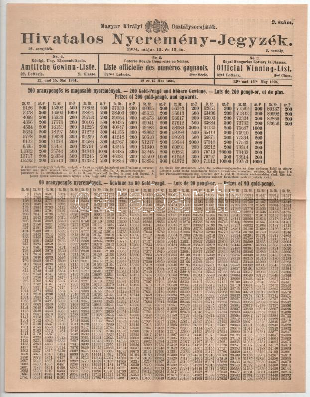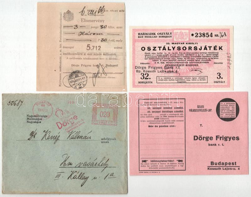 1934. "32. Magyar Királyi Osztálysorsjáték" 3. osztály 1/8A sorsjegye bélyegzéssel, vízjeles papíron + hozzá tartozó értesítővel, megrendelő lappal, fizetési elismervénnyel és nyeremény-jegyzékkel T:AU