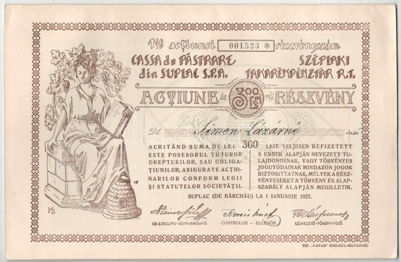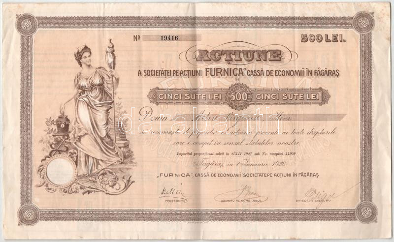 Románia / Berettyószéplak 1927. "Széplaki Takarékpénztár Részvénytársaság" részvénye 300L-ről szelvényekkel + Fogaras 1928. "Fogarasi 'Furnica' Takarékpénztár Részvénytársaság" részvénye 500L-ről szelvényekkel T:F Romania / Suplac (De Barchau) 1927. "Savings Bank of Suplac" share about 300 Lei with coupons + Fagaras 1928. "Savings Bank Share Company 'Furnica' in Fagaras" share about 500 Lei with coupons C:AU,F