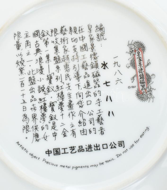 Leírás: 1990 körül, kínai dísztál, jelzett, sorszámozott, hibátlan, eredeti dobozában, d: 21,5 cm