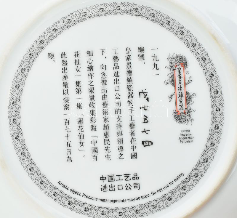 Leírás: 1990 körül, kínai dísztál, jelzett, sorszámozott, hibátlan, eredeti dobozában, d: 21,5 cm