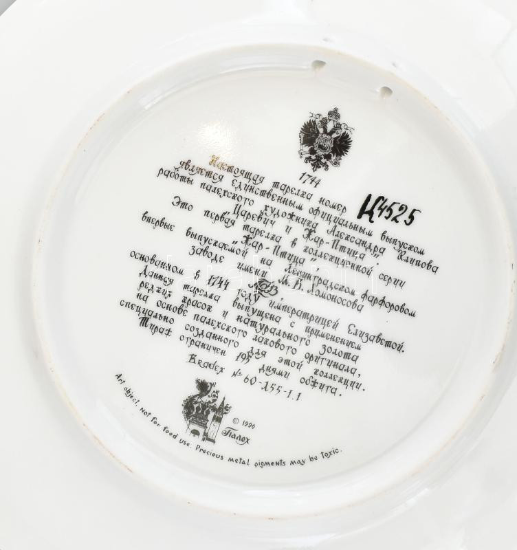 Leírás: 1990, orosz dísztál, mitológiai jelenettel, jelzett, sorszámozott, hibátlan, eredeti dobozában, d: 20 cm