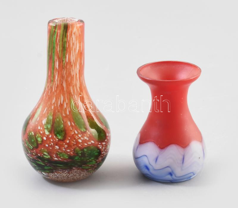 Leírás: Murano 2 darab miniváza. Anyagában színezett üveg, jelzés nélkül, kis kopásokkal, m: 6-8 cm