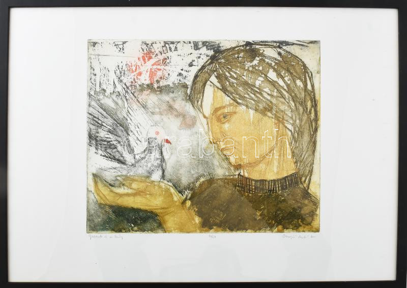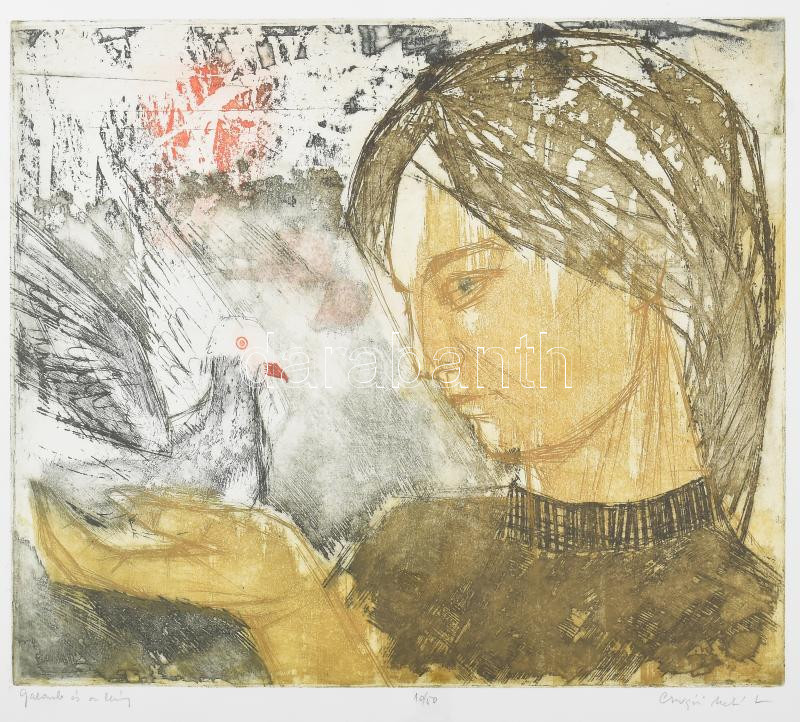 Leírás: Csurgói Máté Lajos (1931-2001): Galamb és a leány. Színes rézkarc, papír, jelzett, számozott (10/50). Üvegezett fakeretben. 29×34,5 cm