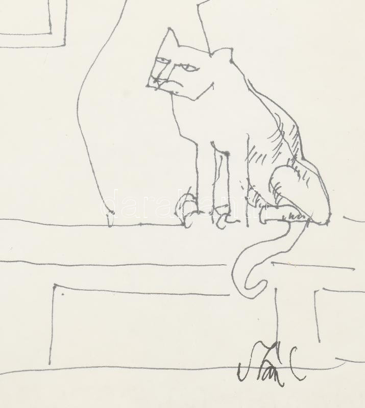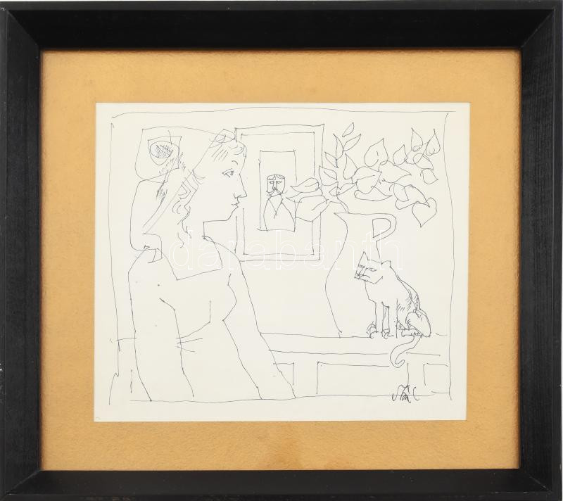 Leírás: Szász Endre (1926-2003): Hölgy macskával. Tus, papír, jelezve jobbra lent, üvegezett fakeretben. 19,5x22,5 cm