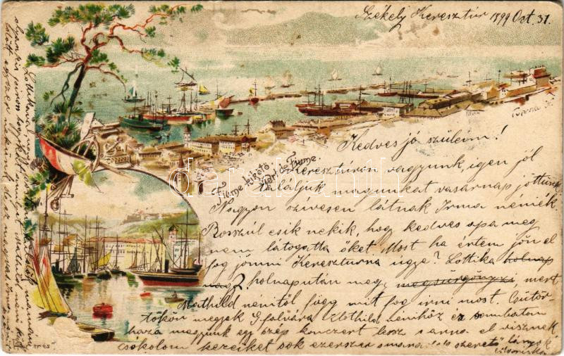 1899 (Vorläufer) Fiume, Rijeka; Port de Fiume / Fiume kikötője. Országos Ezredéves Kiállítás. Kincstári levelezőlap Posner Károly Lajos és Fia műintézetéből / Hungarian Millennium Exhibition, ship station, port, harbor. Art Nouveau, floral litho s: Cserna K. + 2 Kr. barna Ga. (kis szakadás / small tear)