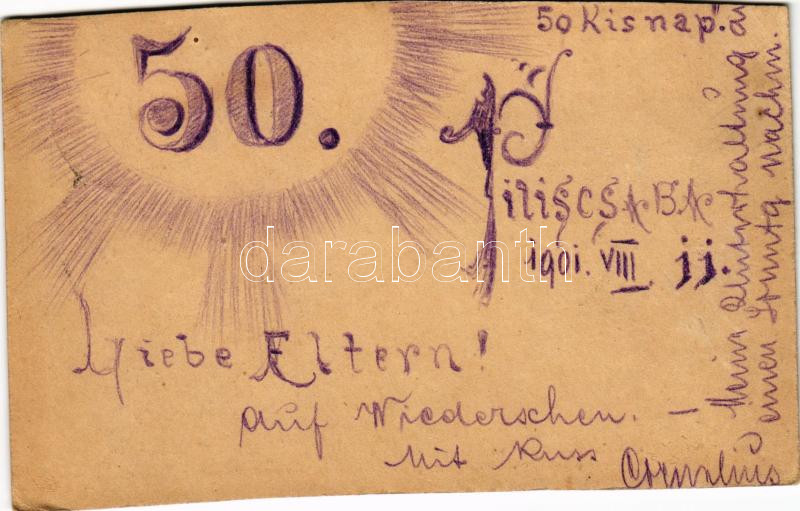 Leírás: 1901 Piliscsaba, 50. Kisnap. Kézzel rajzolt katonai üdvözlet (vágott / cut)