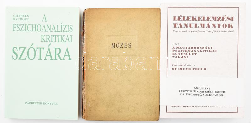 Siegmund Freud: Mózes és az egyistenhit. Ford.: F. Ozorai Gizella. Bp., 1946, Bibliotheca. Első magyar nyelvű kiadás. Kiadói kartonált papírkötés, kopott borítóval, sérült, javított gerinccel. +