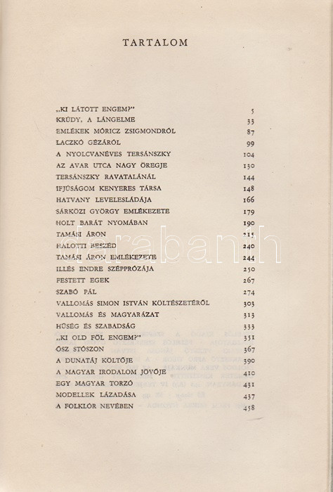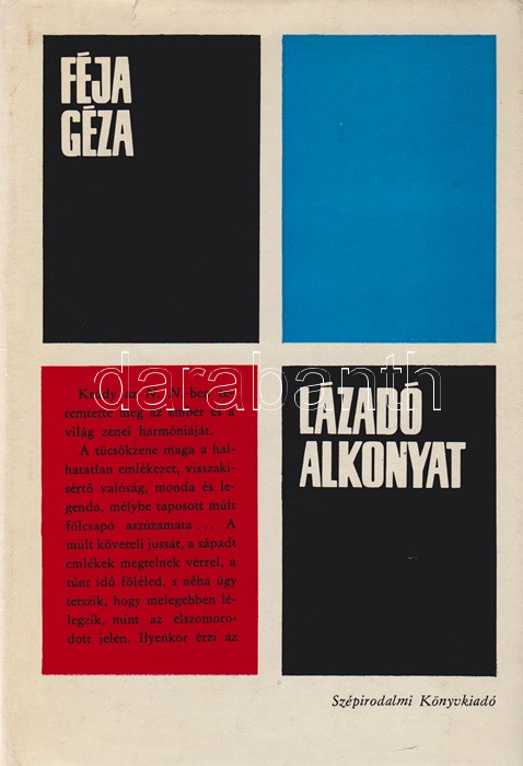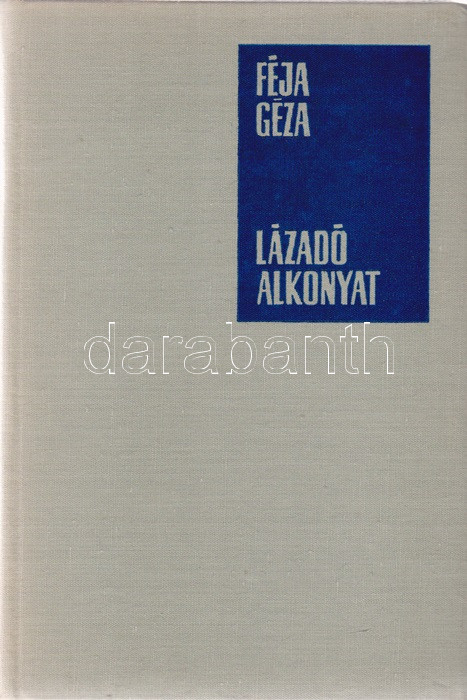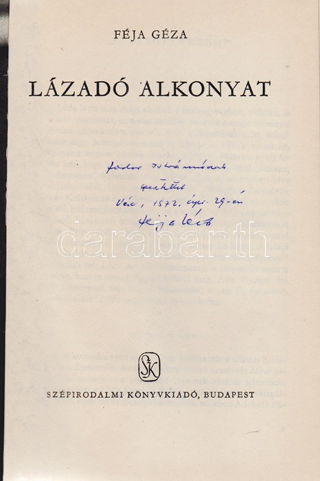 Féja Géza: Lázadó alkonyat. [Irodalmi esszék.] (Dedikált.) Budapest, (1970). Szépirodalmi Könyvkiadó (Pécsi Szikra Nyomda). 1 t. (címkép) + 470 + [4] p. Egyetlen kiadás. Dedikált: ,,Fodor Istvánnénak szeretettel: Féja Géza. Vác, 1972. ápr. 29-én". Az 1945-től politikai nézetei miatt évtizedig nem publikáló Féja Géza (1900-1978) író, egykori falukutató irodalmiportré-sorozatában a szokásostól eltérő irodalmi kánont épít, melyben a szokásos szerzők helyett Krúdy Gyula, Móricz Zsigmond, Tersánszky Józsi Jenő, Tamási Áron a meghatározó alkotók, és amelyben a folklór irodalom is helyet kér magának. Prov.: Fodor Istvánné Márta. [Fodor Istvánné Márta tanárnő, a Magyar Írószövetség titkárnője.] Kiadói egészvászon kötésben, színes kiadói védőborítóban. Jó példány.