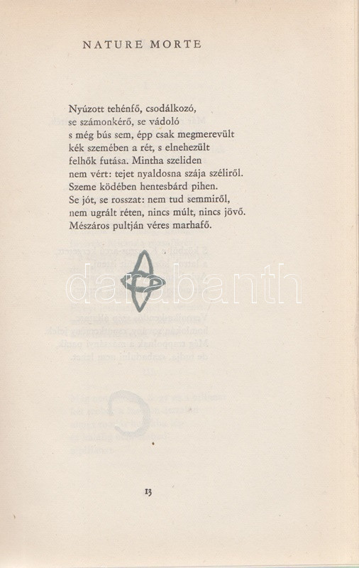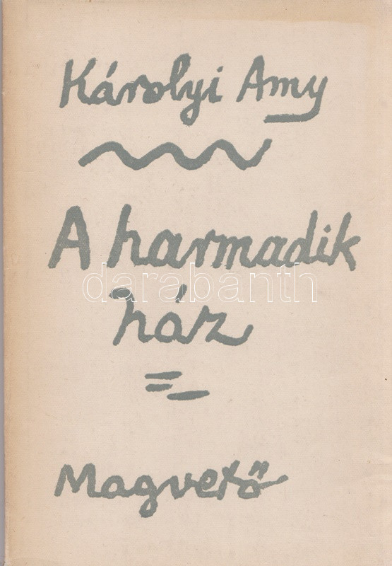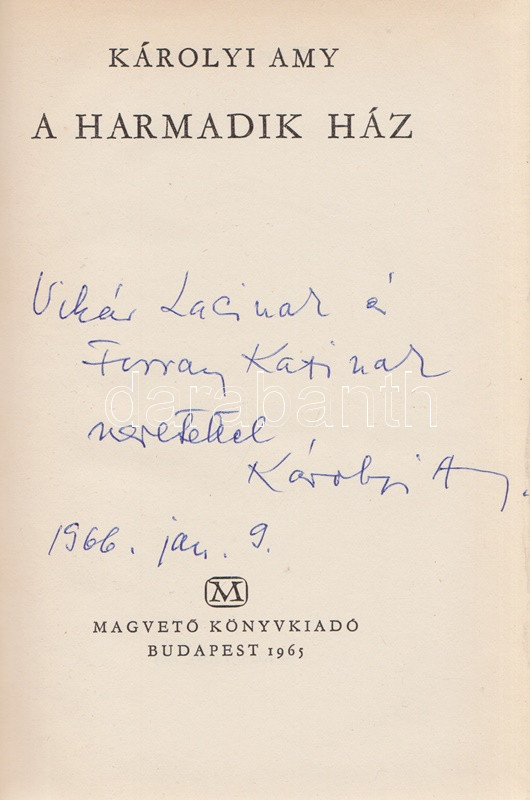 Károlyi Amy: A harmadik ház. (Weöres Sándor rajzaival.) [Versek.] Budapest, 1965. Magvető Könyvkiadó (Alföldi Nyomda, Debrecen). 82 + [2] p. Egyetlen kiadás. Dedikált: ,,Vikár Lacinak és Forrai Katinak szeretettel: Károlyi Amy. 1966. jan. 9." Prov.: Vikár László és felesége, Forrai Katalin. [Vikár László (1929-2017) zenetudós, a Zeneakadémia tanára, finnugor és törökségi népzene-kutató, népdalgyűjtő. Forrai Katalin (1926-2004) zenetanár, karnagy, nemzetközi hírű zenepedagógus.] Weöres Sándor által illusztrált, kiadói egészvászon kötésben és kiadói védőborítóban, felül színes festésű lapszélekkel.
