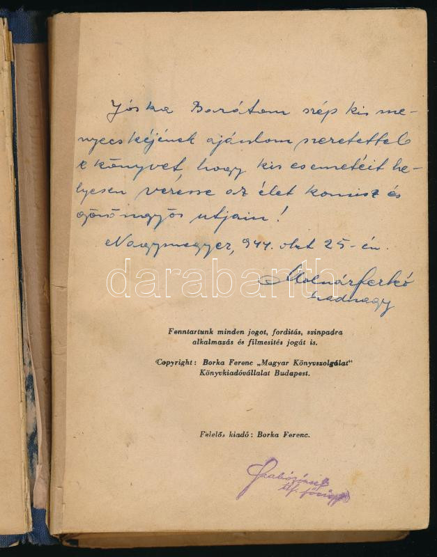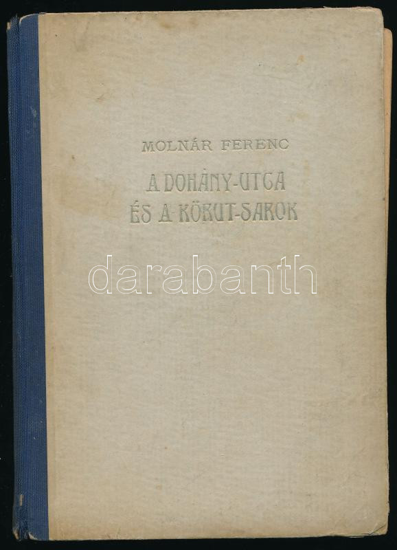 Molnár Ferenc: A Dohány-utca és a Körút-sarok. - - "aszfaltregénye." Bp., [1943], Borka Ferenc "Magyar Könyvszolgálat, 222 p. Névrokon Molnár Ferkó 1944. októberi ajándékozási soraival. Kiadói félvászon-kötés, kopott, foltos borítóval, sérült kötéssel, a könyvtest javított és részben elvált a borítótól, kissé foltos lapokkal.
